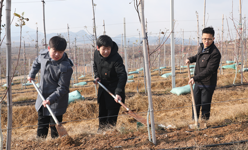 “这个亲结到我们心坎里了”,赵先清高兴地说,他们一定会用好科技助农基金,推广应用肥水一体化技术,推行农业防治、物理防治、生物防治和化学防治相结合的病虫防治方式,减少农药量,既可生产绿色无公害果品,同时也具有较大的生态效益。在村东北头,202亩的苹果矮砧现代集约栽培示范园已经建成,入村党员与村里乡亲一起运肥施肥。龙泉镇副镇长赵海涛介绍,这些苹果可实现一年定植、三年见花、四年结果,六年进入盛果期。进入盛果期后,亩产达到4000kg以上,亩效益达到两万元以上。村里已经成立了玉泉农产品合作社,依托“党支部+合作社”软平台,大力推行“合作社+基地+农户”经营模式,提高土地利用率,降低生产成本,“日子就像这柿子,肯定越过越红火!”